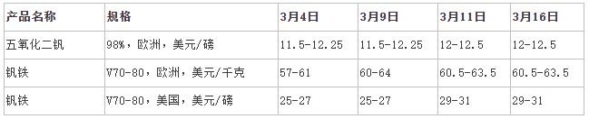 《全球铁合金网》2022-3-17:欧洲市场最新钒铁价格高位持稳运行,昨日(3月16日)欧洲钒铁(V70-80)价格暂稳在60.5(平)-63.5(平)美元/千克钒,折人民币50计价约19.30-20.26万元/吨;欧洲98%五氧化二钒价格在12-12.5美元/磅,折人民币约16.54-17.23万元/吨;美国钒铁(V70-80)价格在29-31美元/磅钒,折人民币50计价约20.39-21.80万元/吨(备注:以上折人民币价格不包含关税、增值税、港口费用)。